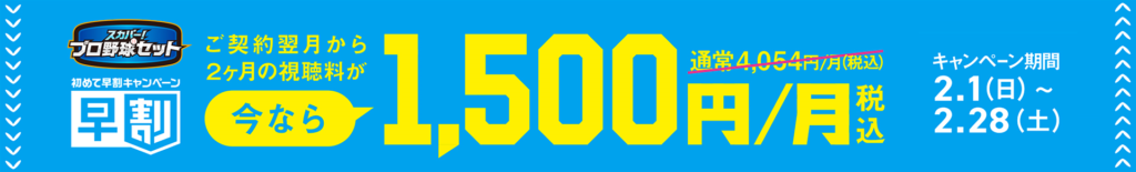 2月中に「スカパー!プロ野球セット」に新規契約すると、翌月(3月)と翌々月(4月)の視聴料が1,500円(税込)に割引されます。